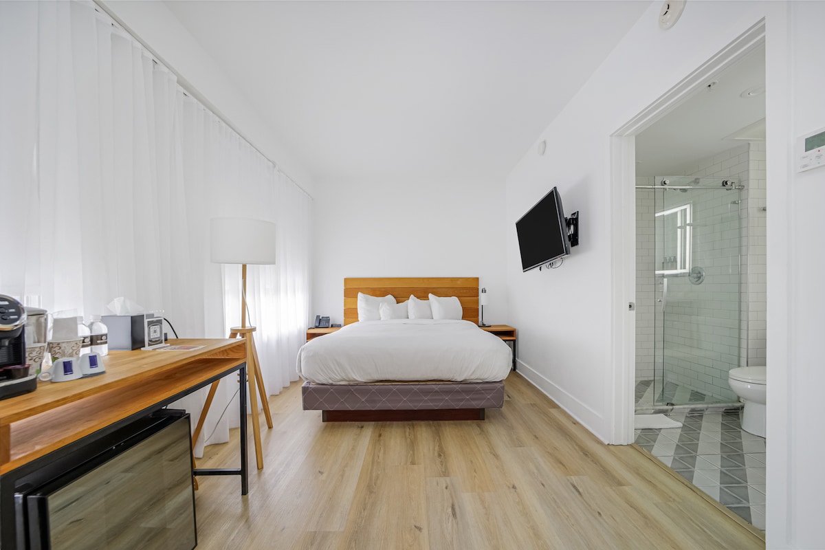 Séjournez dans une suite Art déco lumineuse et spacieuse dans le prestigieux quartier South of Fifth de South Beach, à quelques pas de l'océan. Cette section calme d'Ocean Drive offre une escapade sereine près des terrains de jeux, des parcs canins et des salles de sport en plein air. Explorez des restaurants renommés, des endroits locaux décontractés aux restaurants étoilés au Michelin et profitez d'une vie nocturne animée accessible à pied. Cette unité d'angle lumineuse dispose d'un lit king size, d'un coin repas près de la fenêtre, de DirecTV et de tout le nécessaire pour votre retraite parfaite à Miami Beach.