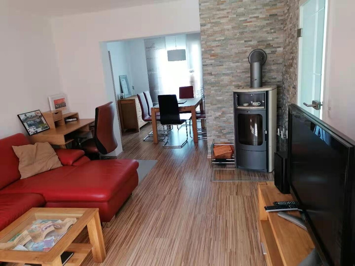Emportez toute la famille dans ce super logement avec beaucoup d'espace pour le plaisir et le divertissement. L'appartement est situé au 2ème étage (dans le grenier), il n'y a pas d'ascenseur. Des livres, des cartes et des jeux de société sont disponibles. Les hôtes sont invités à utiliser le jardin et le barbecue. Nous pouvons également mettre à disposition des vélos à louer pour explorer la piste cyclable Aller-Elbe. Deux carrières situées dans le parc paysager directement adjacent vous invitent à la pêche et à la baignade.