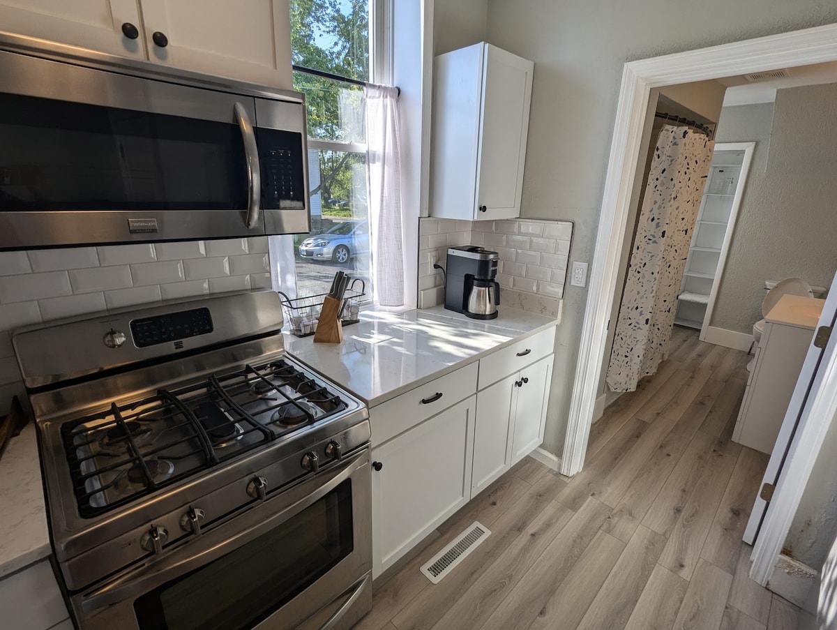 Maison d'hôtes récemment rénovée et confortable. Tout ce dont vous avez besoin se trouve ici dans le quartier historique de Bevo Mill. Au cœur du sud de Saint- Louis, vous n'êtes qu'à quelques pas des commerces locaux, y compris le pittoresque et historique Das Bevo. Entrez dans une oasis de style vintage, avec de grandes fenêtres avec beaucoup de lumière naturelle, de hauts plafonds voûtés, un lit Queen Size confortable, un réfrigérateur unique, un bar pour le petit-déjeuner, une salle de bain spacieuse avec une grande douche à l'italienne. Détendez-vous à l'extérieur à la table de pique-nique sous de jolies guirlandes lumineuses.