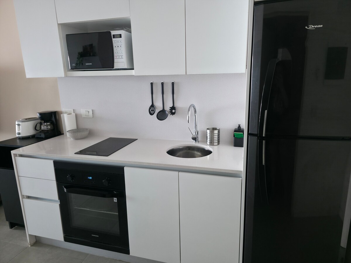 A minimalist studio apartment located on the avenue, just steps away from shops, markets, and restaurants. The Metrobus stop is half a block away, providing easy access to public transportation. Modern building with amenities including an indoor pool, outdoor pool, solarium, barbecue area, large internal park, and co-working space. The apartment is fully equipped for a comfortable stay, featuring air conditioning, Wi-Fi, a fully equipped kitchen, a flat-screen TV, and a dedicated workspace.