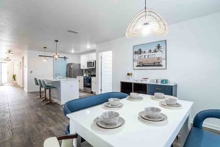 Le Boho Bungalow est situé dans un condominium calme avec de nombreuses commodités. Le logement dispose de 3 chambres, toutes avec des téléviseurs de 55 pouces, ainsi que de 2 salles de bain, d'un lave-linge et d'un sèche-linge. Une cuisine entièrement équipée pour cuisiner est à votre disposition. Il y a une piscine communautaire et un patio extérieur privé à apprécier en famille et entre amis. Cet espace a été conçu pour créer un séjour confortable avec des décorations intentionnellement choisies pour vous connecter à la plage. Arrivée : 16h Départ : 10h