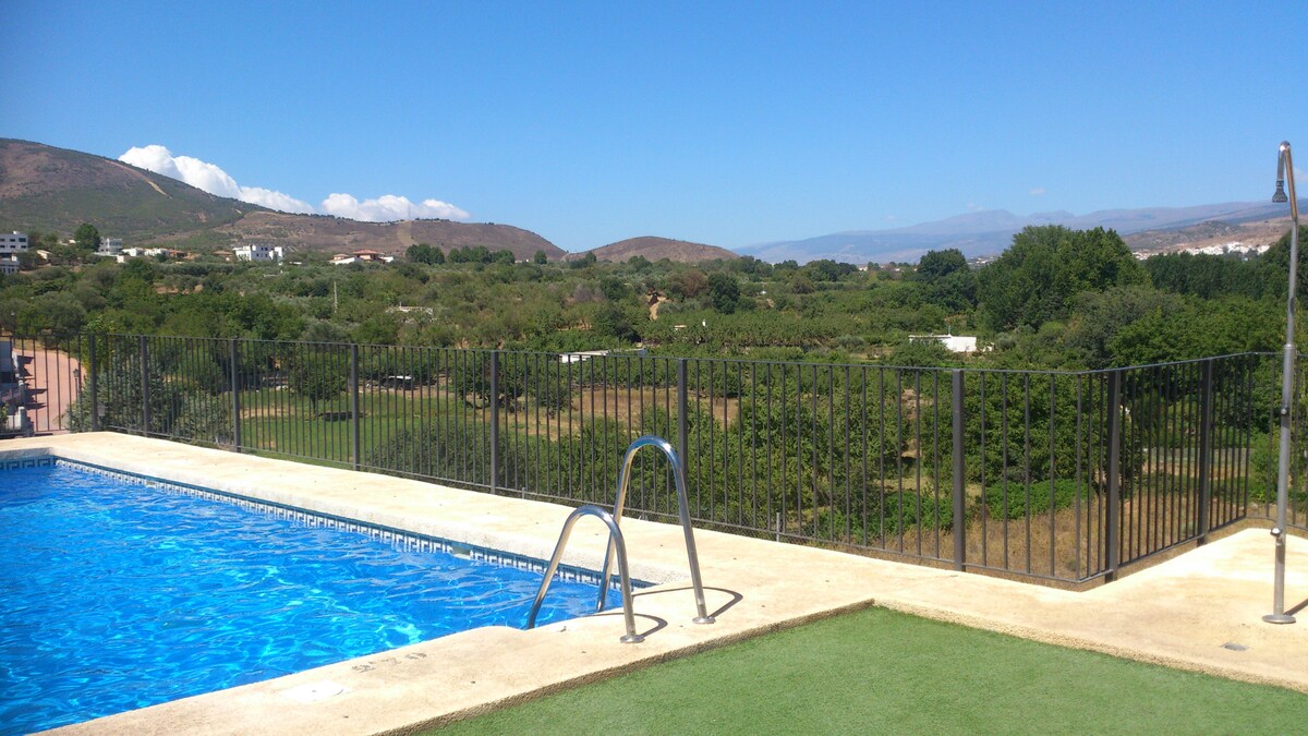 Tropical Studio est un appartement très confortable 100 % durable, totalement indépendant, situé au rez-de-chaussée d'une grande maison de campagne andalouse. Il dispose de deux terrasses, d'un jardin spacieux avec des pelouses vertes luxuriantes et d'une piscine écologique avec de larges espaces de bronzage. Tout cela est entouré de 3 000 m² de terres certifiées biologiques avec des orangers, des avocatiers, des oliviers centenaires et d'autres arbres du sud. La propriété se trouve à Órgiva, entourée d'une nature relaxante, d'un paysage culturel mauresque et de paysages de montagne préservés.