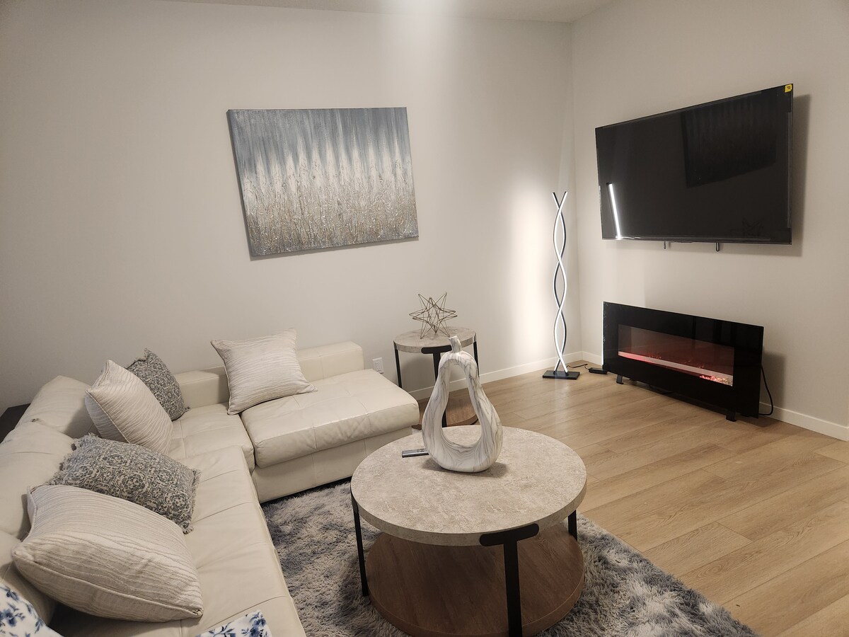 Elegant 2BR Walkout Basement is a private, meticulously curated retreat offering refined comfort and quiet luxury.Enjoy warm evenings by the fireplace and abundant natural light from large windows.This spacious two-bedroom suite features a queen and a double bed ideal for guests who value privacy,cleanliness and an elevated standard of comfort. Direct backyard access and dedicated driveway parking are included.Steps from the Bow River pathways, Sobeys,Seton YMCA and South Health Campus Hospital.
