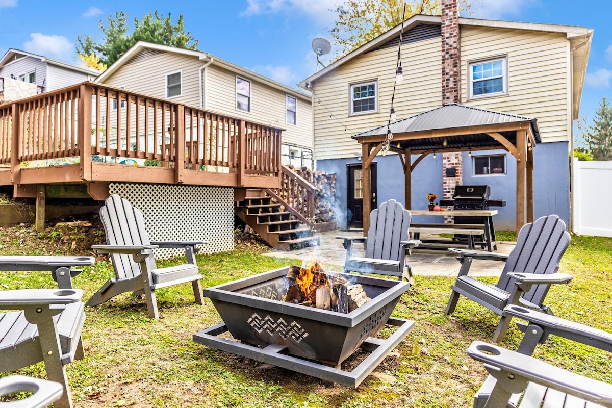 Vous vous détendrez instantanément dans cette maison élégante et adaptée aux animaux de compagnie, à seulement 8 minutes de l'I-70, sortie 42. Sous une canopée d'arbres, vous trouverez une cour magnifiquement aménagée avec des terrasses et deux foyers. Profitez de la cuisine bien équipée avec du café bio issu du commerce équitable. Détendez-vous avec 2 téléviseurs Roku, des jeux et des puzzles, baignez-vous avec des sels de trempage et des serviettes turques. Pour les amateurs d'activités de plein air, plantez vos tentes. Asseyez-vous près du poêle à bois en hiver ou allongez-vous dans un hamac quand il fait chaud. Bienvenue à The Crooked Cottage !