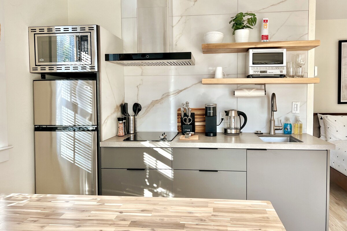 NOW with new AC & Heating! Gorgeous one bedroom apartment with en-suite bathroom, a spacious walk-in closet, ample light, and stunning views. Private fully equipped kitchen and sitting area allow for very comfortable living. Bedroom and sitting area/kitchen are separated by a door to allow for 2 separate work spaces. Washer/dryer and many other amenities available. This is part of a ~4000 sq ft luxury single family home with a completely separate and private entrance.