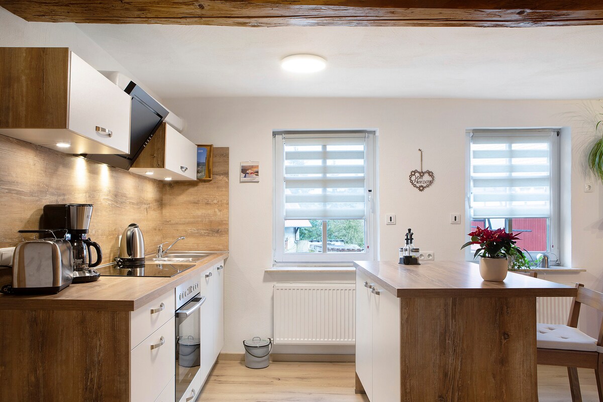 Dans notre appartement de vacances "Fachwerk 44" à Frielendorf dans le Rotkäppchenland, vous vivez dans une atmosphère confortable à colombages dans un grand appartement d'une pièce avec une attention particulière aux détails. L'appartement est situé au 1er étage de notre grande maison d'habitation. Une entrée et un couloir partagés mènent à l'appartement. La cuisine entièrement équipée vous invite à cuisiner et à profiter ensemble avec son îlot de cuisine autoportant et son coin repas.