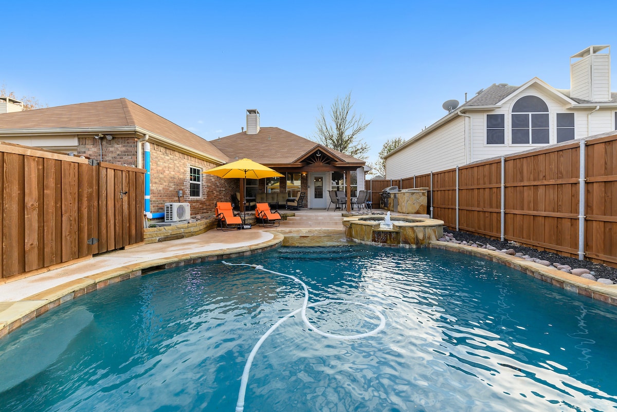 Charming home in the heart of Frisco. Super clean inside & outside with a relaxing heated pool, spa, oversized living room, game room, outdoor patio & firepit for you to experience lovely Texas living! Patio furniture, lounge chairs & a BBQ grill are available in the backyard. We have lots of pool toys, board games, Pool table & toys for the whole family to enjoy. The home is connected with high speed internet & TV. No checkout chores ,enjoy your stay, not spend your last morning cleaning.