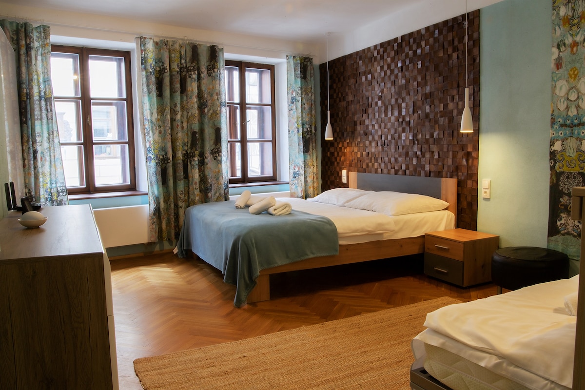 Suite for four, ground floor, 3 guests + extra bed This lovely suite for four situated on the ground floor has a separate entrance hall with the door leading to a generously proportioned kitchen which is equipped with a microwave oven, electric hob, electric kettle, fridge, basic cooking utensils, dining table, sofa bed for 2 guests. The entry to the bedroom with twin beds leads through the hallway. The spacious bathroom provides to our guests a comfortable bathtub with a shower.