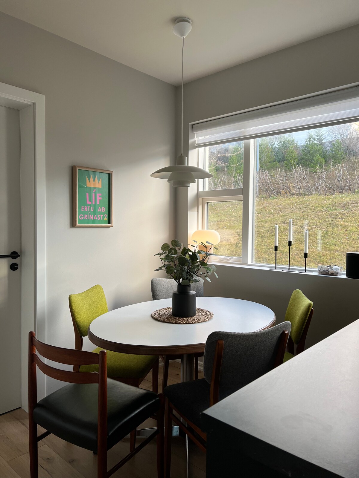 A convenient, stylish apartment with all the amenities. In the lovely Vellir neighbourhood of Hafnarfjörður, the apartment is right next to grocery stores, a Hertz car rental, convenient bus connections, cozy coffee shops, and several of Iceland's iconic swimming pools. By car, central Hafnarfjörður is 5 minutes away, central Reykjavík is 15 minutes away, and both Keflavík Airport and the Blue Lagoon are just 30 minutes away.