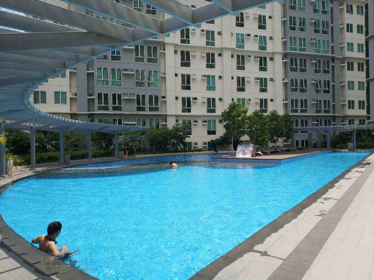 L'espace est un condominium d'une chambre de 38 m², avec balcon, donnant sur une vue imprenable à 90 degrés sur Alabang, Skyway, et la piscine et le jardin luxuriant de l'immeuble, ce qui en fait un équilibre entre espaces urbains et espaces verts. Idéal pour passer des vacances, pour le télétravail ou pour les familles qui souhaitent se détendre et profiter du temps passé ensemble. Il s'agit d'une unité construite avec des détails complexes - spacieuse par rapport à une chambre d'hôtel au même prix. Notre propre parking souterrain est fourni aux voyageurs sans frais supplémentaires.