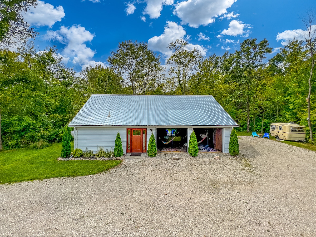 Escapade romantique Boho/Industrielle - 2 niveaux, 6 acres boisés. Hamac intérieur et 2 portes blindées de garage ouvrant sur l'extérieur(saisonnier) Espaces de couchage ouverts avec lit queen size et 2 futons à l'étage. Foyer extérieur, jacuzzi, 2 vélos. Campeur Trillium vintage 1973 @ extra 50 $ / jour avec location de cabane uniquement. Antiques, restaurants, Mt. Holly Ski Resort, Pine Knob Concert & Ski/Snowboard Resort, lieux de mariage, Heather Highlands Golf & Holly Oaks Park à quelques minutes. Angel Wings photo op murale.
