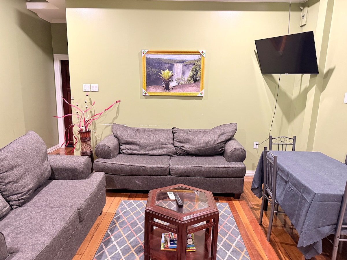 Appartement au rez-de-chaussée entièrement meublé avec 2 lits et 2 salles de bain à Queenstown. Comprend une connexion Wi-Fi haut débit, des caméras de sécurité, la télévision connectée/par câble, une sécurité 24h/24 et 7j/7, un générateur, de l'eau chaude et froide, la climatisation, un lave-linge et un sèche-linge. La propriété est en excellent état avec de hauts plafonds, des chambres spacieuses et est située au centre ; à 60 minutes de l'aéroport CJIA, à 10 minutes du centre-ville de Georgetown et à 15 minutes des centres commerciaux. Le supermarché et la boulangerie sont à quelques pas seulement. Un service de navette aéroport peut être organisé.