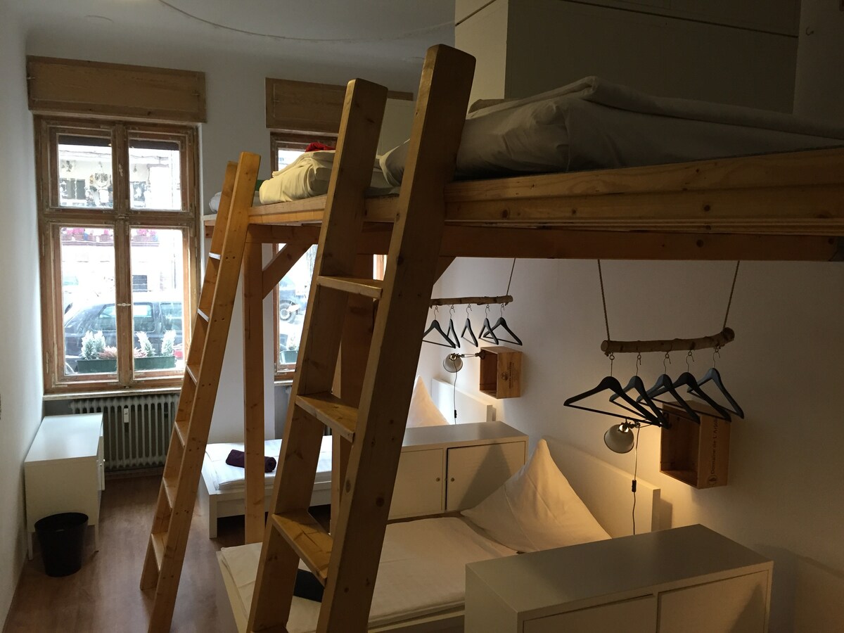 Ici, dans la belle Kreuzkölln, j'ai créé un endroit où jusqu'à 10 personnes peuvent se sentir comme à la maison dans un appartement en colocation internationale. Il y a deux chambres doubles et une chambre à coucher de 6 personnes qui sont partagées. Dans le quartier, il y a de nombreux cafés pour le petit-déjeuner et des restaurants pour le dîner. Le canal pour faire du jogging ou se promener. Le marché hebdomadaire et les magasins de vintage pour faire du shopping ou se promener. Je me ferai un plaisir de vous donner des conseils pour que vous puissiez faire l'expérience de Berlin à votre guise.