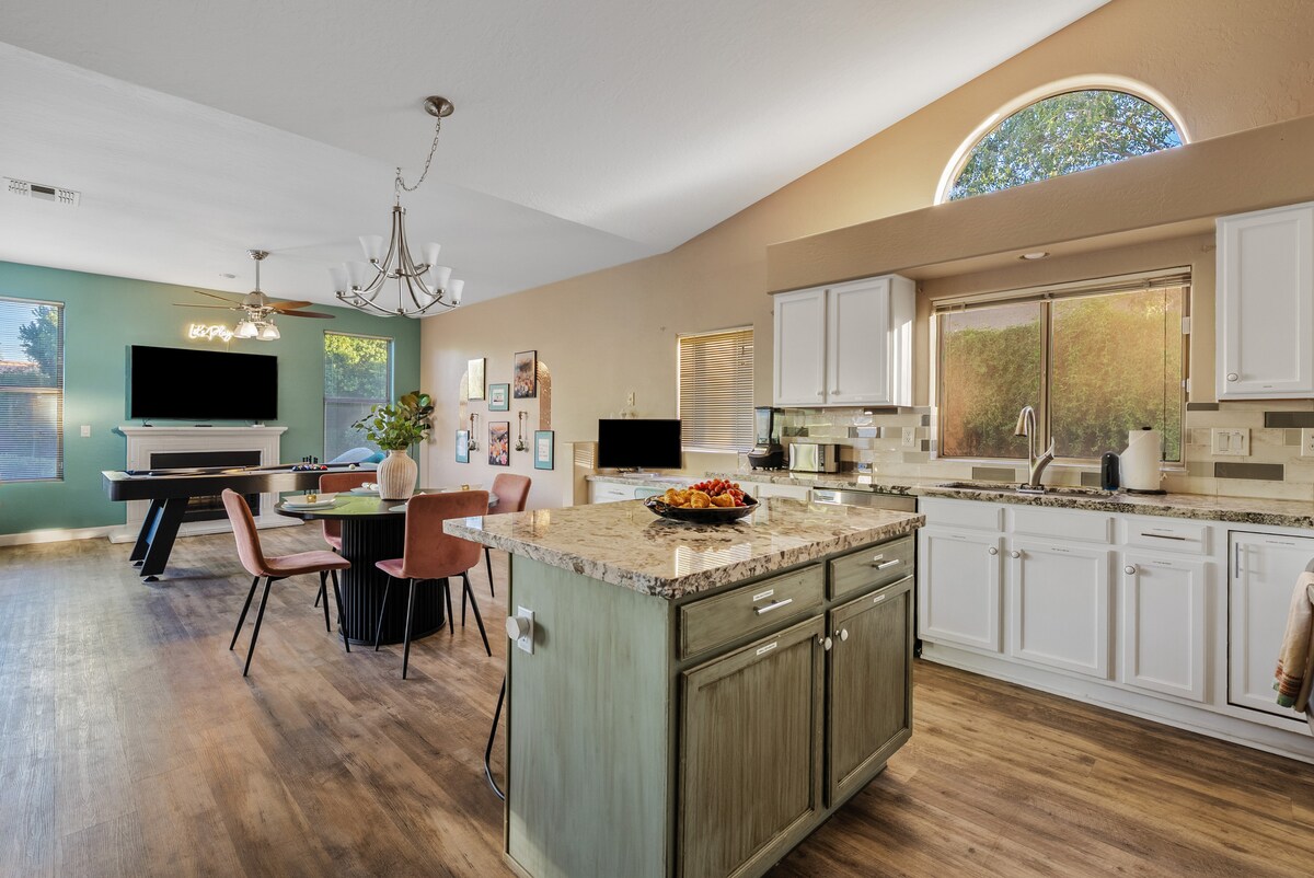 Freshly remodeled and designed by Lexi Grace Design. This southwestern single-story ranch home sits on an acre of green grass and mature trees in a quiet neighborhood. 5 bedrooms that comfortably sleep 12 on new Tuft and Needle Mattresses, beautiful bedding and fully furnished for any stay length. Come enjoy beautiful AZ sunsets by the pool*, cuddled up next to the fireplace, or in the spa at night. Thoughtfully designed for an amazing stay experience. *Pool heating upon request w/ flat fee