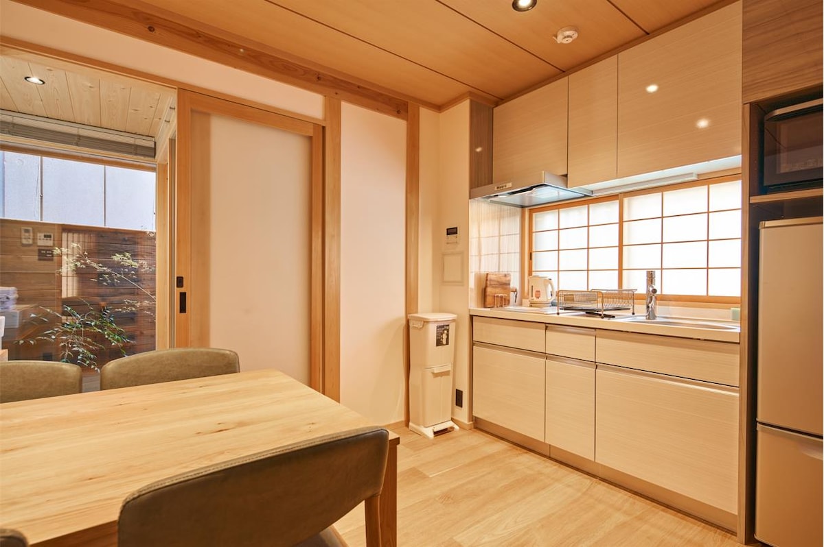 Kyomachiya Private Lodging « Takasegawa Shichijo » est un kyomachiya de 115 ans entièrement rénové. Le kyomachiya, qui forme le magnifique paysage de Kyoto, a été remodelé en un bâtiment à haute étanchéité à l'air et à haute isolation thermique afin que vous puissiez passer un moment confortable pendant les étés humides et les hivers froids uniques à Kyoto tout en conservant la structure d'origine. Depuis la chambre de style japonais au premier étage, vous pouvez voir le jardin tsubo (un jardin menant au salon de thé) avec une image « roji ». De plus, nous avons installé un canapé dans le couloir afin que vous puissiez vous détendre et profiter de la vue sur le jardin tsubo. Le soir, vous pourrez vous détendre en admirant le jardin tsubo illuminé. Il y a 2 chambres au 2ème étage, une avec 2 lits simples et une avec 1 lit double. Si vous êtes 5 personnes ou plus, nous pouvons préparer un futon dans la chambre de style japonais au 1er étage et l'utiliser comme chambre à coucher, mais cela peut être un peu compliqué. La cuisine est équipée d'ustensiles de cuisine et de vaisselle pour une cuisine simple.