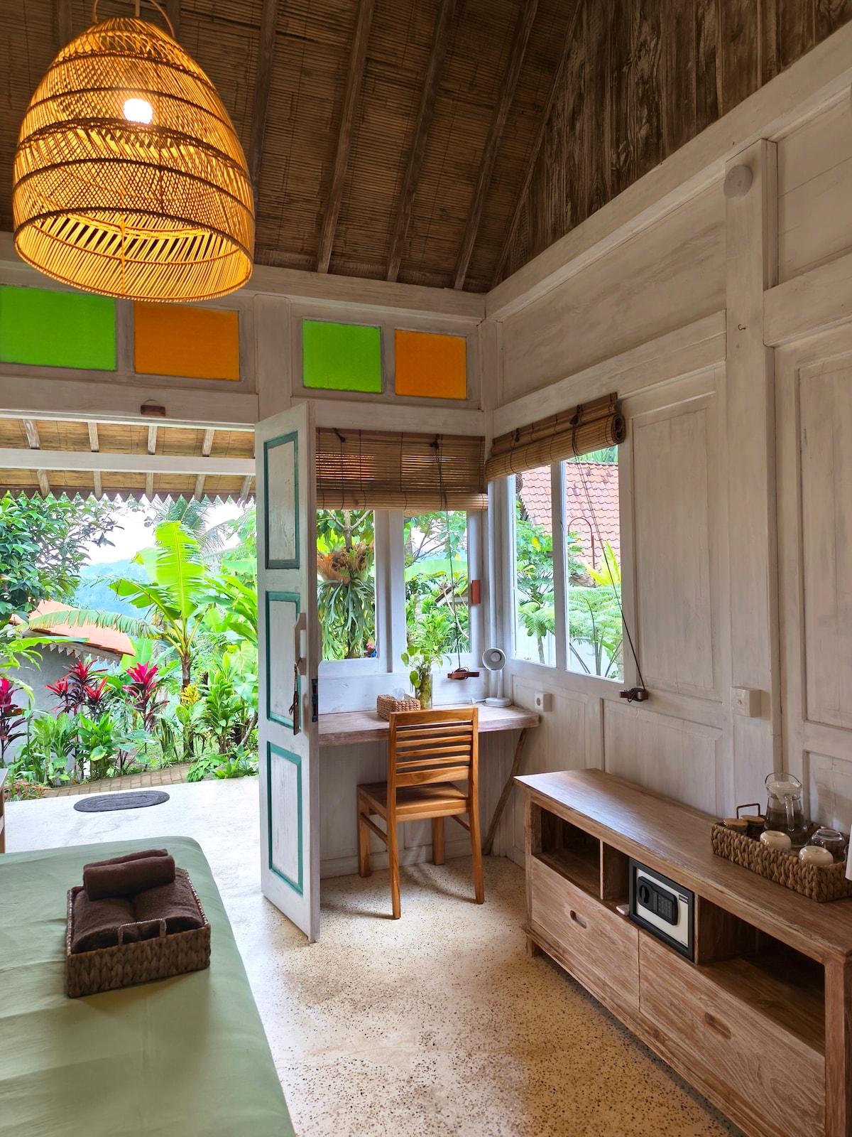 Ce bungalow est une confortable maison en bois de 40 m2 avec une salle de bain spacieuse, de l'eau chaude et une terrasse privée nichée dans un charmant jardin tropical. Le matin, les oiseaux sont les voisins les plus proches. Vous adorerez le confort de cette villa dans un environnement naturel. La maison est idéale pour un couple, un voyageur solo... des jeunes mariés. Située à 600 m au-dessus du niveau de la mer, au bord d'une rivière de montagne, les nuits sont fraîches et rafraîchissantes. Pas besoin de climatisation.