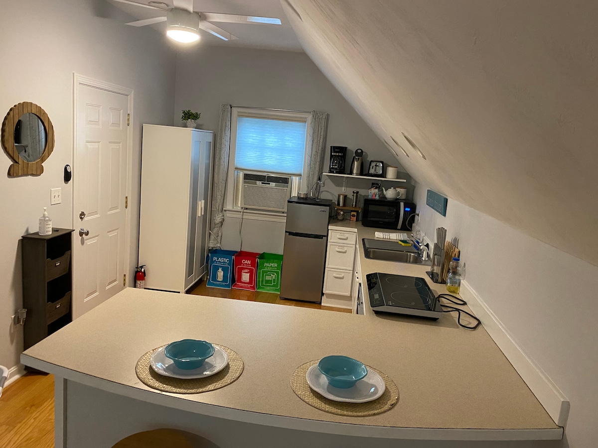 Studio lumineux et aéré avec lit queen size. Le lit de jour s'ouvre en lit King Size si nécessaire. La cuisine dispose d'une cafetière, d'un grille-pain, d'une plaque de cuisson à induction, d'un micro-ondes et d'un petit réfrigérateur-congélateur. Salle de bain complète. TV, avec Firestick connecté à Hulu Live, disponible. Haut-parleur Bluetooth Bose et système de jeu classique Super Nintendo (avec 20 jeux) pour votre plaisir pendant votre séjour. Wi-Fi gratuit pour les voyageurs. Draps et serviettes fournis. L'accès à l'appartement se fait par le garage et par un escalier privé.