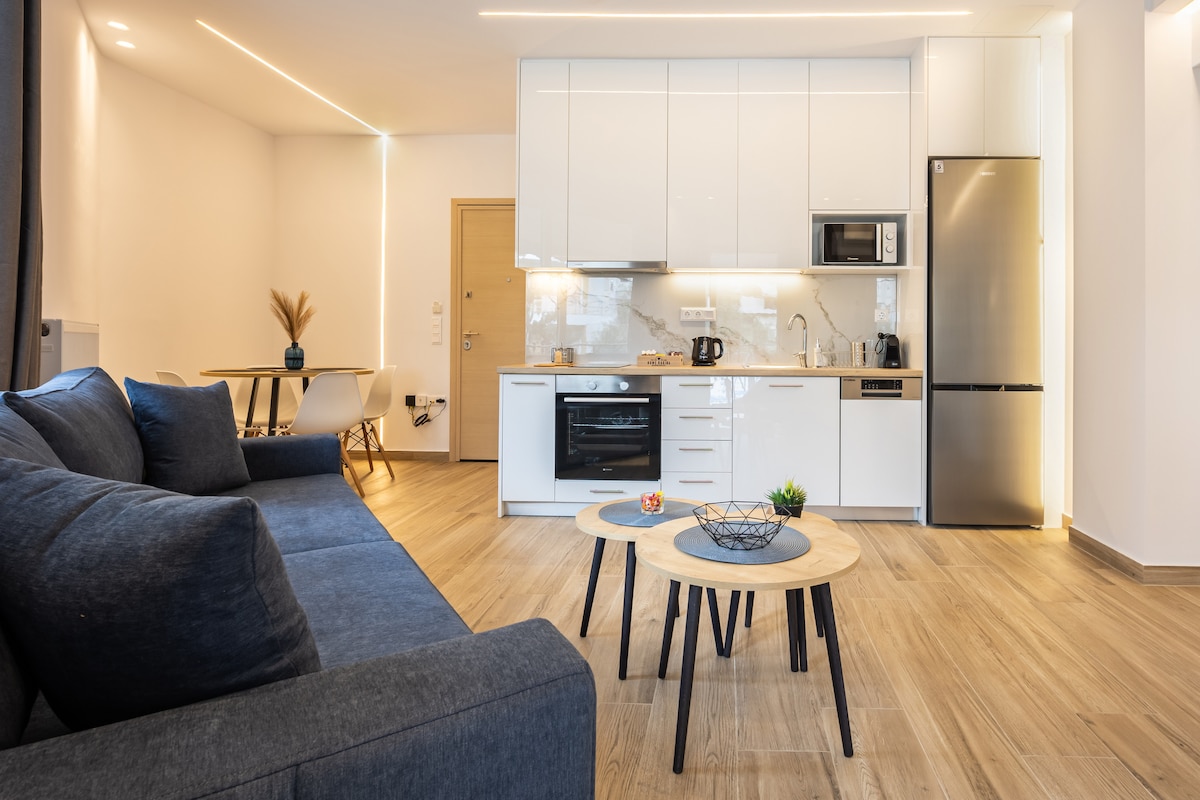 Un appartement élégant d'une chambre de 56 m² à Gerakas, à seulement 15 minutes en voiture de l'aéroport international d'Athènes via Attiki Odos. Baigné de lumière naturelle, il dispose d'un salon ouvert, d'un balcon privé, d'une cuisine entièrement équipée avec des appareils haut de gamme et d'une chambre confortable avec des draps haut de gamme. Profitez d'une connexion wifi haut débit, de la climatisation, de l'eau chauffée à l'énergie solaire et d'une télévision connectée. Nettoyé avec des désinfectants de qualité hospitalière et une purification de l'air par UV. À quelques pas des cafés et restaurants de la place centrale de Gerakas !