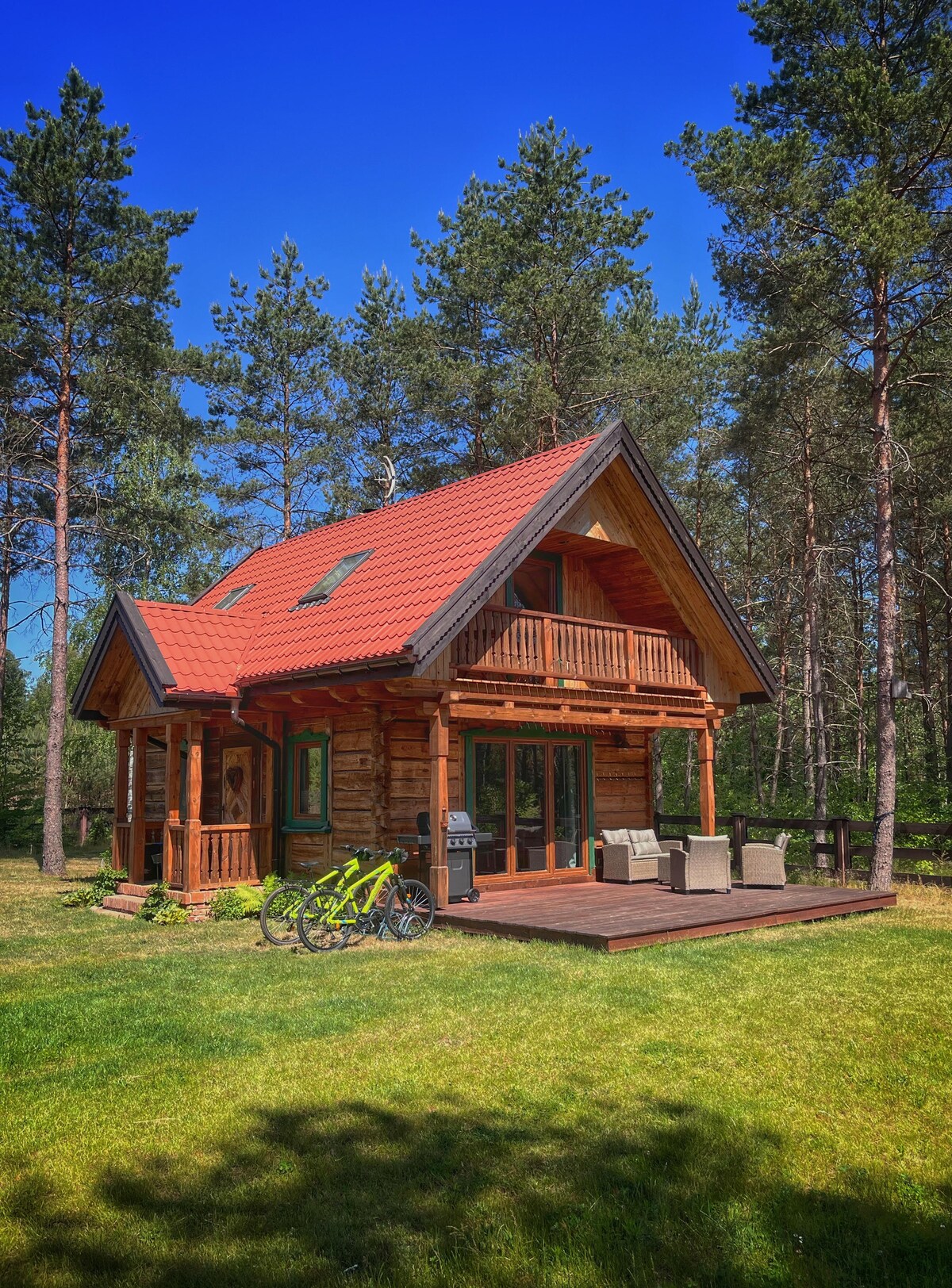Notre maison en bois a été conçue de manière moderne et fonctionnelle. Nous avons essayé de nous fondre parfaitement dans l'environnement et de ne pas perturber la nature qui nous entoure de tous côtés. Notre petit village n'a pas cédé au temps, tout fonctionne ici comme avant. Il n'y a pas de magasin, pas de restaurant, pas de touristes, seulement le silence et la nature. Le village est entouré de prairies et de la forêt de Puszcza Piska, à 10 km des villes les plus proches. Les grues et d'innombrables oiseaux d'eau vous invitent à un spectacle quotidien. Ici, vous trouverez la paix