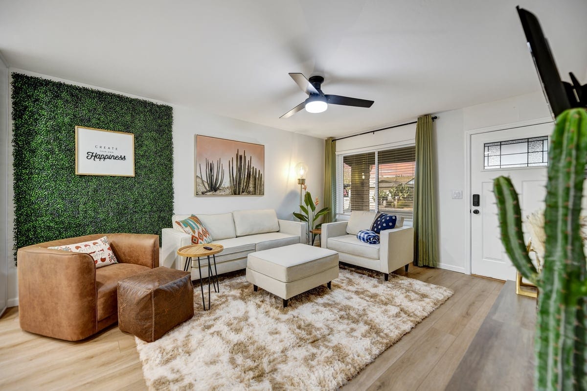 Profitez de notre maison d'hôtes privée de 1 lit et 1 salle de bain récemment rénovée et conçue par des professionnels. La suite élégante et confortable comprend une cuisine complète avec de nouveaux appareils électroménagers, un espace de travail, un salon et une chambre avec un placard et une salle de bain attenante. Elle est située à seulement 15 minutes des principales destinations, telles que l'ASU, l'aéroport international Sky Harbor et des attractions amusantes. Nous offrons un stationnement gratuit sur la propriété, en plus du Wi-Fi, de Roku TV et d'articles de toilette. Nous serions ravis de vous accueillir !