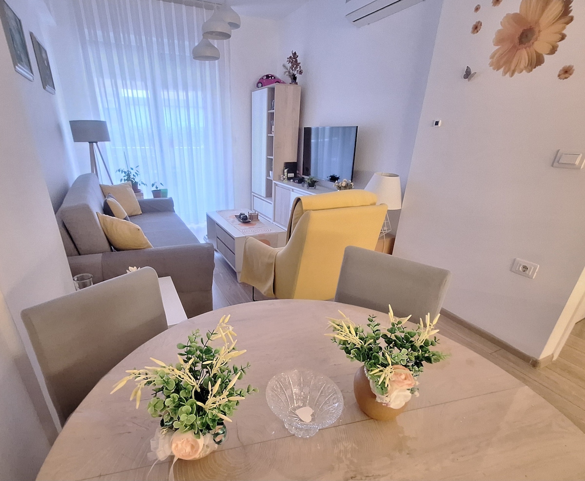 Appartement entièrement équipé dans un endroit paisible et calme. L'appartement est situé au 5e étage dans un immeuble neuf avec ascenseur. Il dispose d'une cuisine, d'une salle à manger, d'une salle de bains, d'un salon et d'une terrasse avec vue dégagée. Entièrement meublé avec : climatiseur, table à manger en bois massif, deux grands placards intégrés, etc. Une place de stationnement gratuit est disponible. À seulement 5 minutes à pied d'un magnifique parc appelé « Saraj » et d'un grand bord de rivière. À 15 minutes en voiture du plus beau canyon de Macédoine du Nord appelé « Matka ».