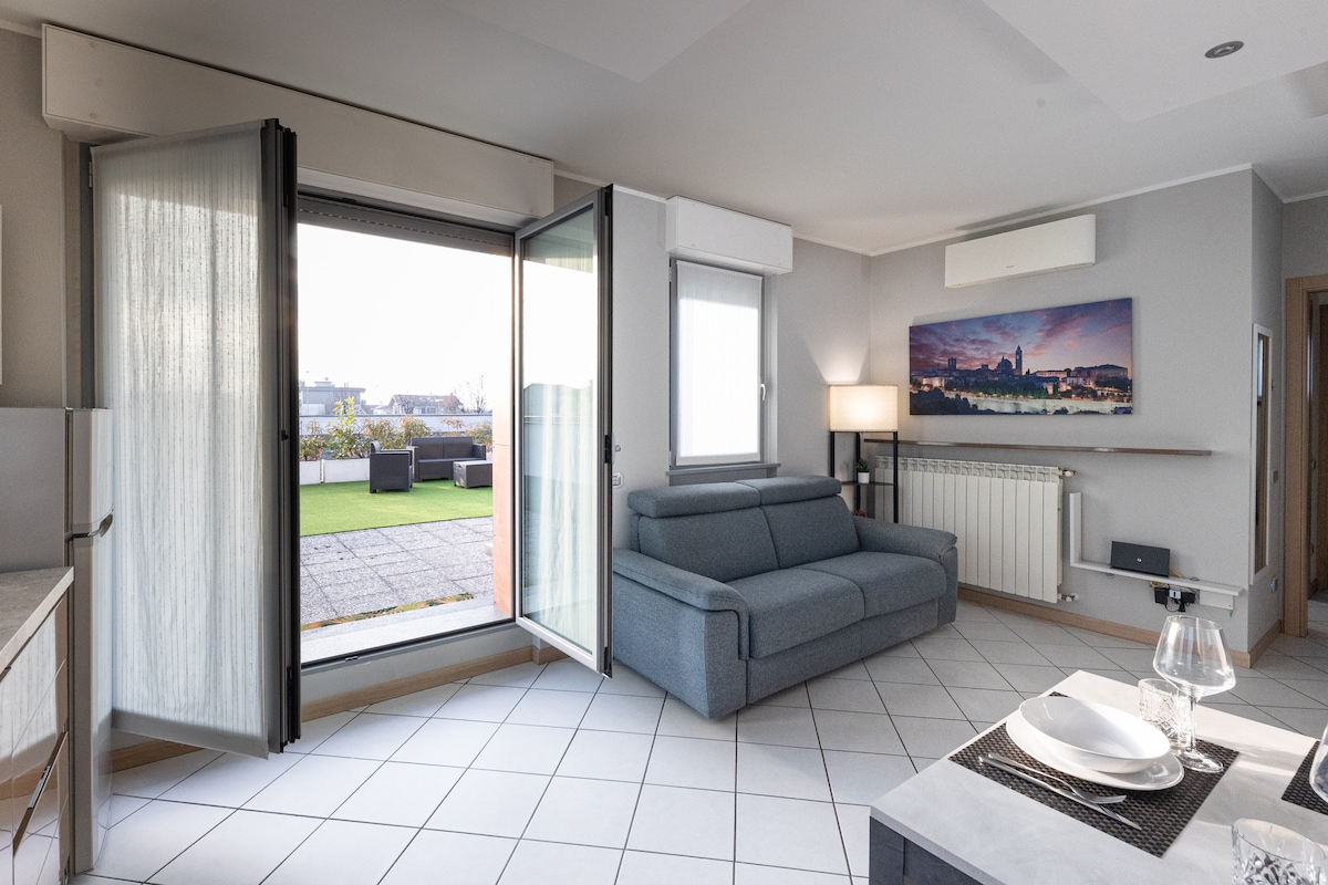 Élégant appartement à 1,5 km de l'aéroport d'Orio al Serio BGY, à proximité du centre de Bergame, du centre d'Orio et de la foire de Bergame. L'appartement dispose d'une chambre avec un lit double, salon avec canapé-lit deux places, cuisine équipée, cuisinière à induction, micro-ondes, bouilloire, machine à café, télévision, wifi, climatisation dans la chambre et dans le salon, salle de bains avec douche, sèche-cheveux et lave-linge. Self check-in et petit déjeuner offert par nous. Parking disponible à la demande.