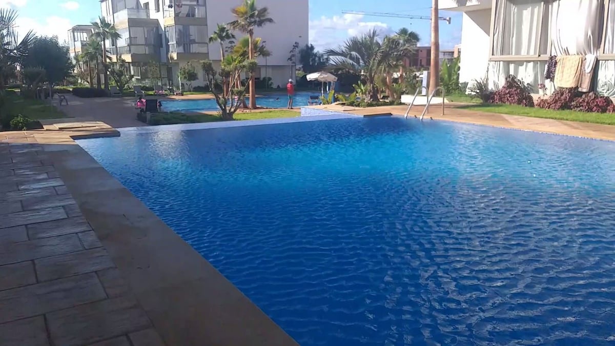 Bonjour, Je mets en location un appartement de 90m². L'appartement est situé dans la résidence Marbella Beach à Mansouria. L'appart est meublé,ensoleillé, propre avec 2 chambres en lits double+grand salon avec TV et salle à manger + cuisine équipée + 2 salles d'eau + deux balcons (vue sur mer et vue sur piscine). La résidence est sécurisée + Piscines + Air de jeu + Super marché. A 10 min en voiture des plages Mimoza, David et 25 min de Daomé, Bouznika Idéal pour une famille entre 5 et 7 pers.