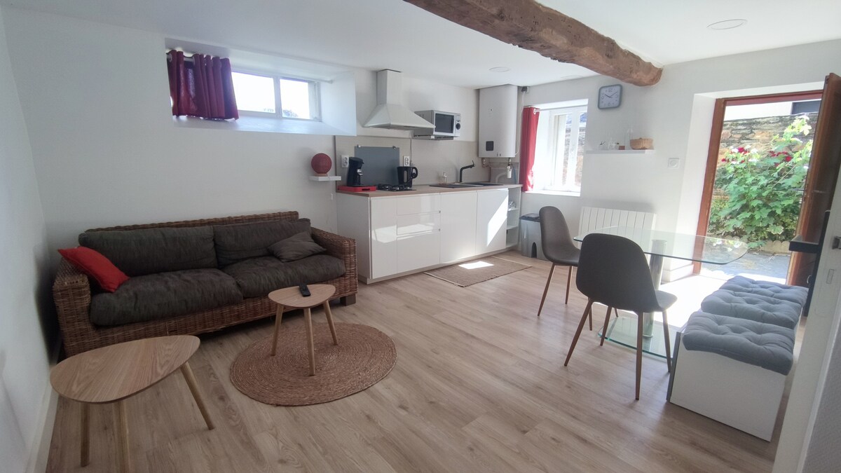 Joli gîte indépendant dans la continuité de notre longère de caractère. Nous vous accueillons dans un cadre bucolique, calme et chaleureux. Vous pourrez profiter de notre terrasse et notre jardin arboré. C'est un gîte spacieux et lumineux où vous bénéficiez d'un grand espace pour cuisiner et partager de bons moments. À l'étage une chambre de 30 M2 et ses deux lits doubles. Enfin, une salle de bain privative et un WC.