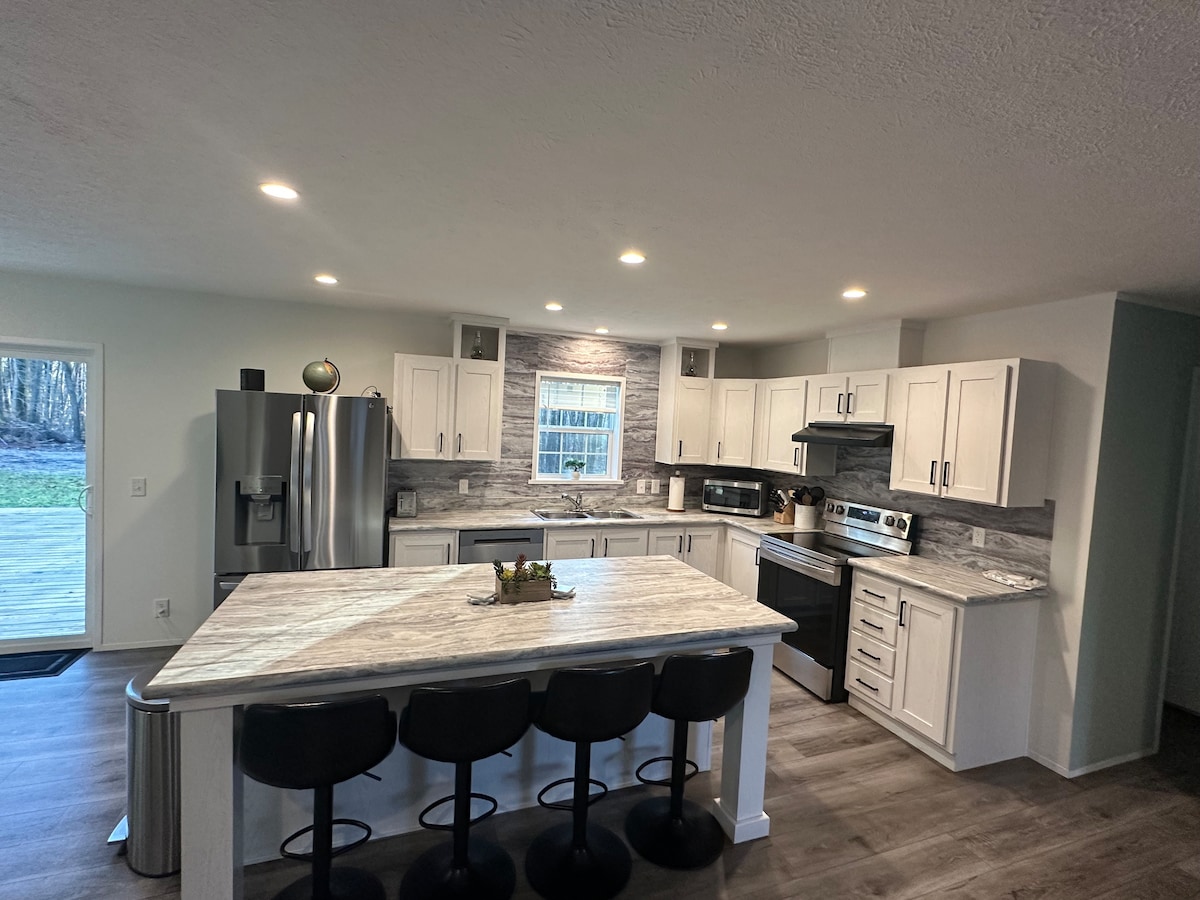 La cabane est nichée à l'arrière d'un terrain boisé privé de 3,6 acres, à quelques pas du lac pour tous les sports. La maison rénovée dispose de deux chambres, d'un loft, d'une salle familiale, d'un lave-linge/sèche-linge, de toutes les commodités d'une maison. Profitez des 160 pieds de bord de lac au large de notre quai privé. Nous avons 2 kayaks, un canoë et un petit bateau de pêche, des bouées et des gilets de sauvetage pour la navigation de plaisance ou la natation. Profitez d'une journée au lac, préparez le dîner sur l'un de nos grils et profitez de la soirée au coin du feu.