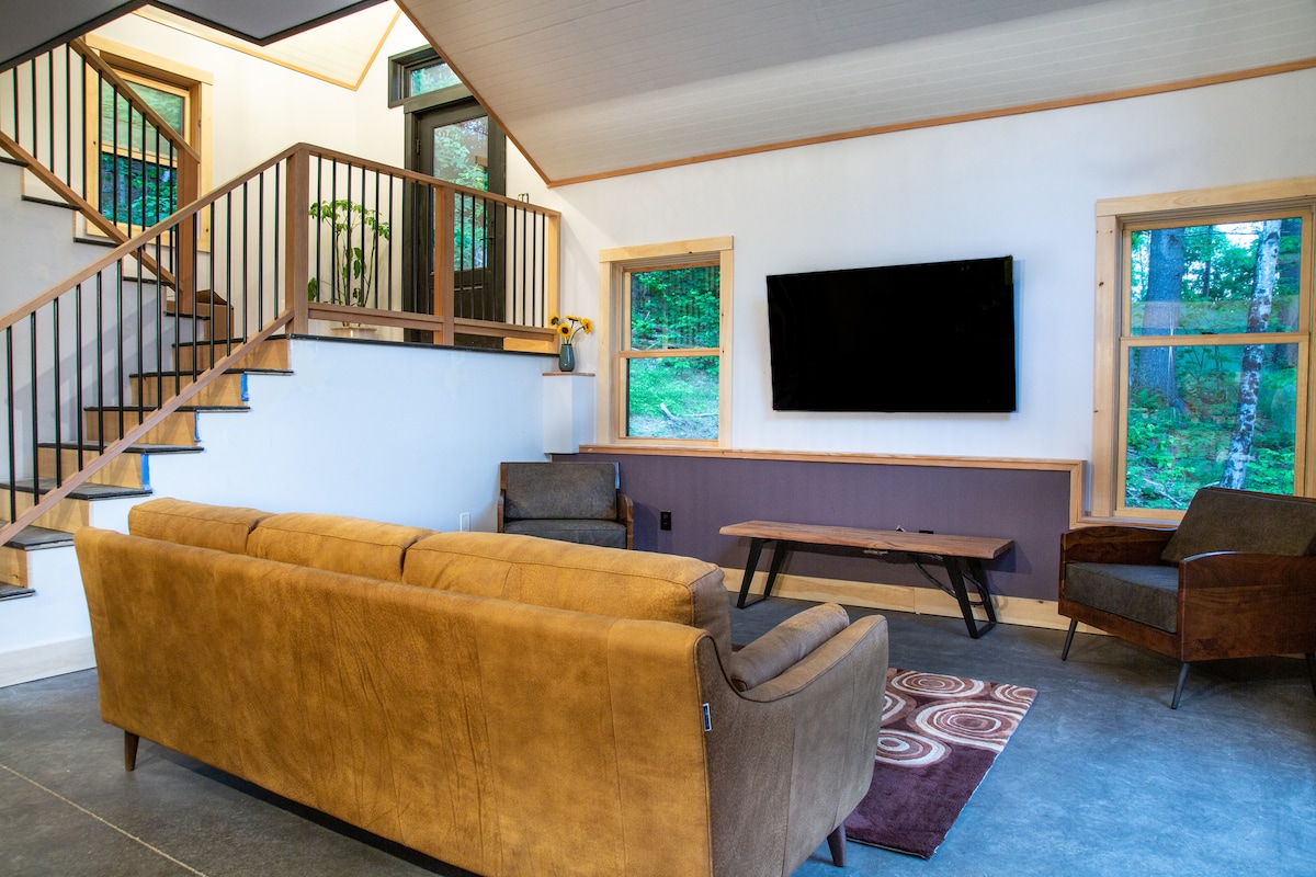 Comme présenté dans Condé Nast Traveler (1/21/22) Retraite paisible et impeccable avec une vue à 180 degrés sur les plus hautes montagnes du Vermont. Près des premières aventures de ski, de randonnée et de plein air du Vermont, vous adorerez la vue sur le coucher du soleil et l'atmosphère confortable (énorme peau de mouton devant la cheminée) et le souci du détail (détails sur le bois, salle de bain de type spa). C'est une retraite incroyable pour les couples et les familles, les aventuriers et les voyageurs d'affaires !