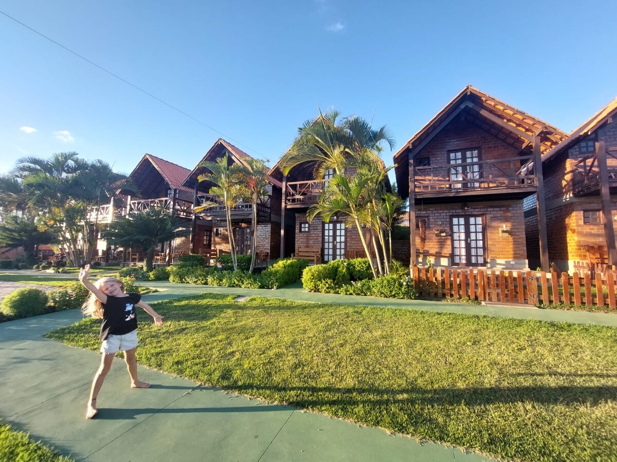 Notre chalet est recommandé pour seulement deux personnes pour répondre à tous les profils. Vous trouverez : Chambre avec lit double, air et TV ; Cuisine américaine avec ustensiles de base pour les repas (couverts, assiettes, casseroles, ouvre-bouteille), plaque de cuisson, micro-ondes et un salon avec un canapé en forme de « L » avec une télévision intelligente. Nous avons un excellent espace de soutien avec une piscine partagée. Il est interdit d'utiliser le barbecue dans l'espace commun.