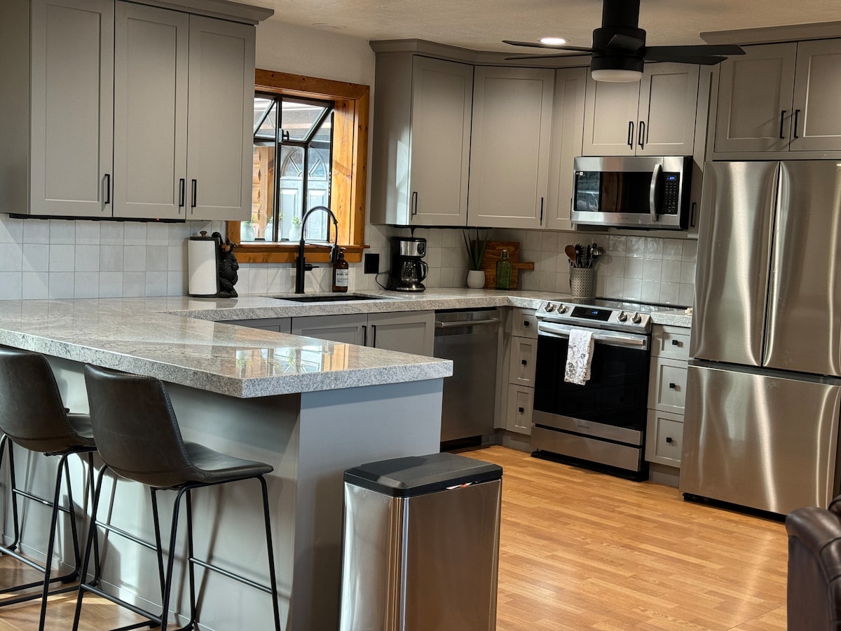 Shoreline Tiny maison située sur le canal de Rainbow Lake ! Cette cabane de 600 pieds carrés avec 1 chambre et 1 salle de bain dispose d'un lit Queen Size et d'un canapé-lit futon. Parfait pour un couple ou une petite famille. Pendant les mois les plus chauds, lancez un kayak juste à côté de la cour dans le chenal et pagayez autour du magnifique lac ! Ensuite, détendez-vous pour l'happy hour et profitez du magnifique extérieur autour d'un feu de camp sur le rivage, ou profitez du grand patio enveloppant avec un foyer à gaz et de nombreux sièges.