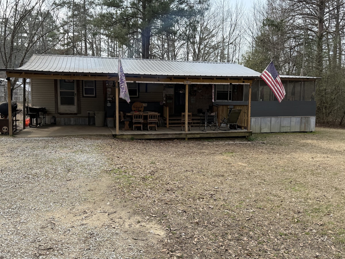 Cabane dans les bois avec tout le confort d'un chez-soi. À un mile de la rampe de mise à l'eau de Piney Woods sur le lac Grenada. À un mile du terrain de golf The Dogwoods. À quelques minutes du centre-ville et de la réserve naturelle de Lee Tartt. Vous pouvez pêcher dans l'étang à côté du chalet. L'allée circulaire facilite le déplacement de votre remorque de bateau. Branchements électriques extérieurs. Télévision par satellite. À 1,75 miles de l'autoroute 8. À quelques minutes de l'I-55 et du Super Walmart Center.