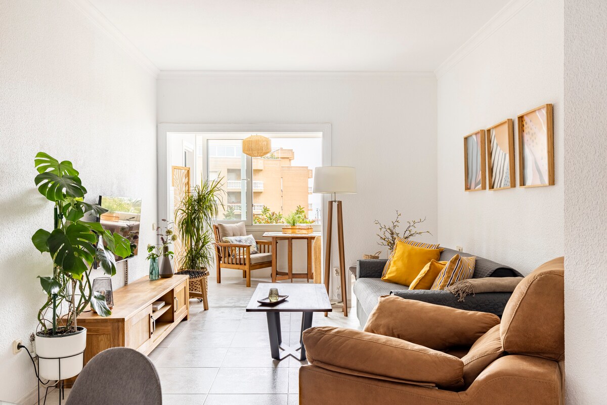 Réveillez-vous et marchez jusqu'à la plage depuis cet appartement spacieux et élégant. Trois chambres, deux salles de bains complètes et une grande terrasse avec 3 ambiances différentes, peuvent accueillir jusqu'à 6 personnes afin qu'elles puissent profiter de la plage, de la promenade et de l'infinité de cafés, restaurants et bars de plage de la région. Parking, piscine pour adultes et une autre pour enfants. NOUS N'ADMETTONS PAS LES GROUPES DE JEUNES OU LES ENTERREMENTS DE VIE DE GARÇON OU DE JEUNE FILLE Piscine ouverte du 1er juin au 30 septembre
