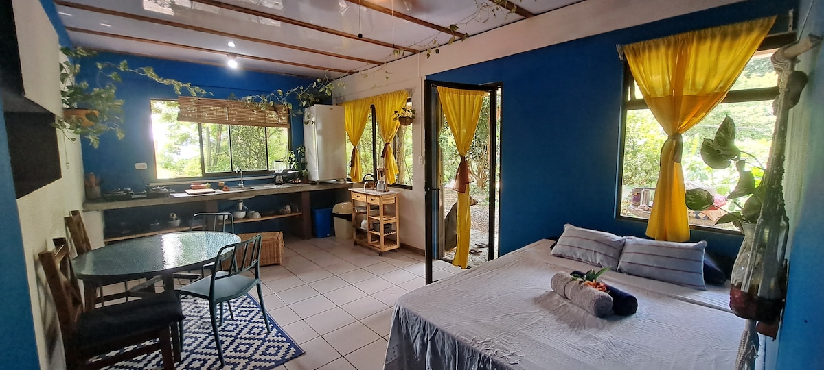 Studio avec entrée privée sur la zone de la piscine. Emplacement idéal à 25 min de l'aéroport LIR, à 2 min des belles plages de Playa Panama, à 8 min de Playa Hermosa et des épiceries, ainsi que des troupes de singes qui traversent les arbres tous les jours. Il dispose d'une cuisine entièrement équipée, de la climatisation, d'un lit Queen Size Murphy, du Wi-Fi Starlink, de l'eau chaude et d'une place de parking sécurisée. La salle de sport complète et la piscine sont à votre disposition. Nous avons souvent des œufs frais à partager ainsi qu'un jardin où vous pourrez cueillir vos propres salades et herbes.