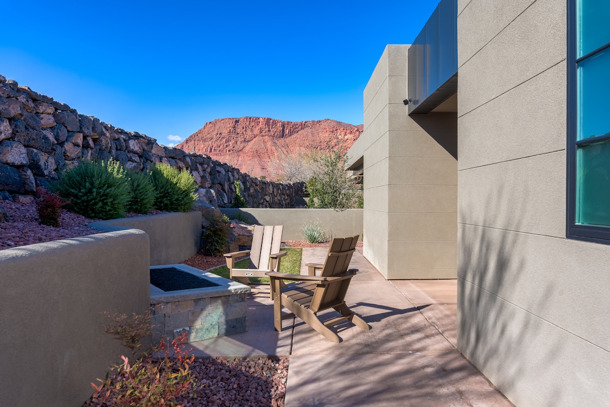 Venez profiter d'une escapade relaxante dans notre nouvelle maison de luxe située au pied du parc d'État de Snow Canyon dans la communauté fermée exclusive d'Encanto Resort. Profitez de la tranquillité des montagnes de roches rouges environnantes, détendez-vous dans le spa ou la piscine chauffée avec vue panoramique sur les roches rouges ou détendez-vous et dégustez un verre de vin au coin du feu tout en profitant de la sérénité de la chute d'eau de la cour arrière. Vous êtes à seulement quelques minutes du complexe de golf Black Desert, de la randonnée, du vélo, du spa Red Mountain et de l'amphithéâtre Tuacahn.