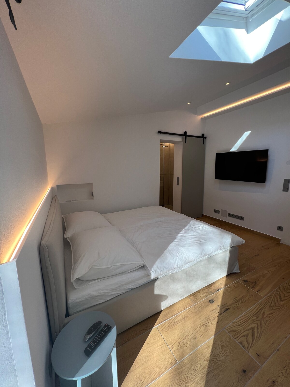 Cet élégant studio-terrasse présente un design unique à trois niveaux avec des espaces de vie et de couchage ouverts sous de superbes plafonds en forme de V. La lumière naturelle inonde l'espace à travers de nombreuses fenêtres de toit, mettant en valeur un mobilier neutre élégant. Le studio comprend une cuisine moderne, une salle de bain luxueuse et un espace d'entrée. Profitez d'un accès direct à un jardin privé, offrant une escapade paisible. Un mélange parfait de luxe, de charme et de confort pour un séjour inoubliable.