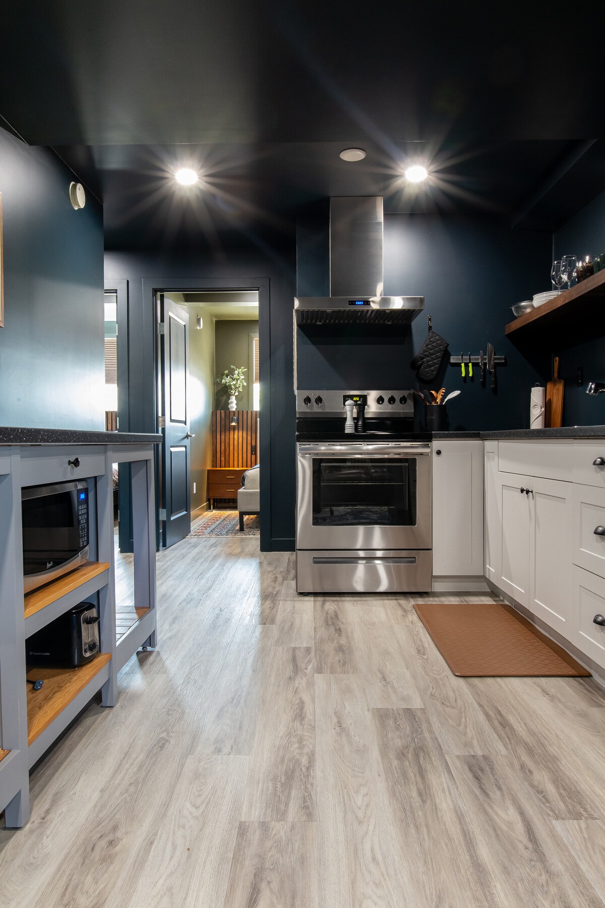 Suite exécutive 2 chambres 2 salles de bain avec plafonds voûtés de 13'. La cuisine gastronomique avec fermeture en douceur, comptoirs en quartz et appareils en acier inoxydable vous fera vous sentir tellement chez vous que vous ne voudrez pas partir. La chambre principale dispose d'énormes fenêtres, d'une douche attenante en carreaux de verre et d'un dressing ! La 2e chambre a un bureau, mais peut avoir un lit simple si nécessaire. Le salon dispose d'une télévision grand écran avec câble et une connexion Wi-Fi gratuite est fournie. C'est un séjour unique en son genre !