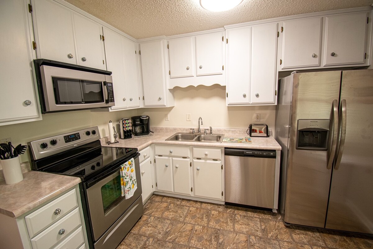 L'ensemble du groupe bénéficiera d'un accès facile à tous les sites et commodités depuis ce bungalow central. Profitez d'une journée complète au lac, à quelques minutes. Venez dans votre maison loin de chez vous. Dînez dans les restaurants locaux, à quelques pas seulement. Asseyez-vous près du foyer pour vous détendre. Réveillez-vous avec une tasse de café gratuite. Profitez d'une mini séance d'entraînement dans votre salle de sport à domicile. Parfait pour les séjours plus longs --- cuisine complète et buanderie. 3 lits Queen Size. Lit double supplémentaire. Matelas en gel/mousse à mémoire de forme de Nectar dans la chambre principale. Charmante maison construite en 1896.