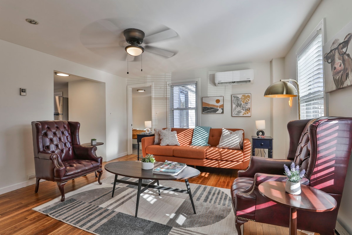 Appartement d'accueil prêt à l'emploi, meublé et entièrement équipé près du centre-ville et de la rivière dans la classe ouvrière, quartier de poche généralement calme. Entrée séparée, couchage/salon spacieux, beaucoup de fenêtres, lit DOUBLE, canapé, climatisation, télévision, câble et WiFi, salle de bain 3/4. Nous désinfectons les espaces avec des lampes UVC et des produits de nettoyage de qualité hospitalière dans le cadre de nos protocoles de nettoyage et de désinfection en profondeur, se fermant souvent entre les voyageurs. Arrivée à distance. MARCHEZ JUSQU'au marché frais local, aux restaurants, cafés et bars pour emporter ou manger.