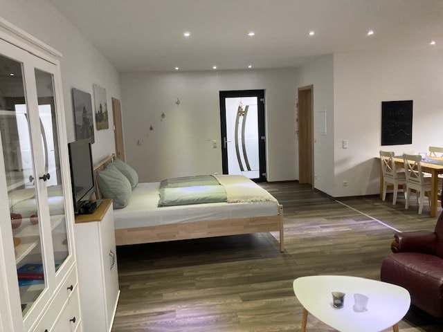 Nouvellement rénové après les dommages causés par la tempête ! Petit studio séparé derrière la maison principale avec parking , vue magnifique sur la vallée d'Ahr à proximité. Petite salle d'eau attenante avec douche et toilettes, coin cuisine de base avec une double plaque de cuisson, réfrigérateur, réfrigérateur, micro-ondes, micro-ondes, bouilloire, grille-pain et coin salon. Il y a un petit patio à l'extérieur avec des sièges. À 28 km du Nürburgring. 4 sentiers de randonnée se trouvent juste devant la porte d'entrée. Village de campagne très tranquille. Commerces, banque, etc. à proximité Ahrbrück (4km) Animaux de compagnie sont les bienvenus