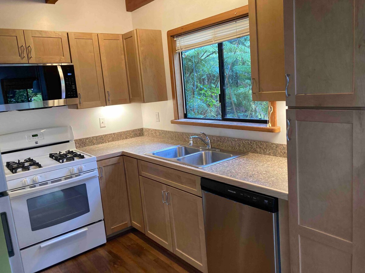 Bonne nouvelle, j'ai amélioré mon WiFi pour en faire le meilleur de notre région. Je sais maintenant que les besoins de nos clients ont changé et qu'un bon WiFi est indispensable. Nous avons également ajouté une terrasse couverte avec un barbecue pour votre confort. Le Volcano Hidden Cottage est un emplacement centralisé facilitant l'exploration du côté est de Big Island. Très privé, plein de romantisme, cuisine, cheminée et beaucoup de fenêtres donnant sur la forêt tropicale.