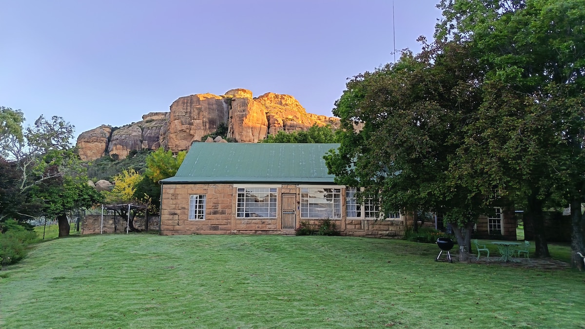 Golden Rock Guest House is the original Schaapplaats Farm house. Comfortable and spacious, ideal for large families (11 guests). Golden Mole and Jemima Puddle Duck Cottages are available in the same garden if more beds are needed. Huge garden, unbelievable mountain views. Exciting walks through the Whimsical Wood, rock pools, cave paintings and mountains. Farm pool. Located on a dirt road, 6kms from Clarens town, close enough for shopping and eating out. 4x4 required in the wet season.