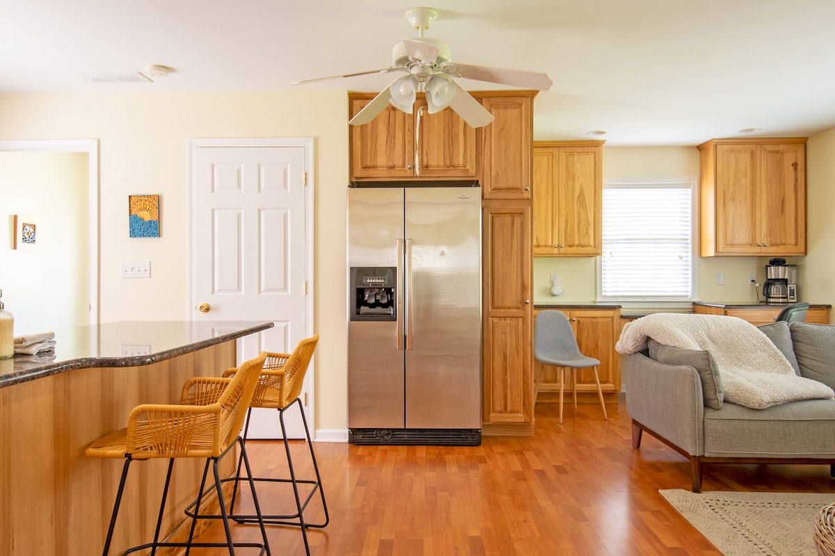 Bienvenue dans notre charmante suite située au cœur de la vallée historique de Brandywine. Niché à l'entrée d'une grange de 12 000 pieds carrés magnifiquement convertie, cet espace offre un séjour vraiment unique et mémorable. Notre logement spécial est parfaitement situé entre le célèbre musée de la rivière Brandywine et le vignoble de Chadds Ford, et en quelques minutes, vous pouvez explorer la beauté enchanteresse des jardins de Longwood ou plonger dans le monde de l'histoire à Winterthur.