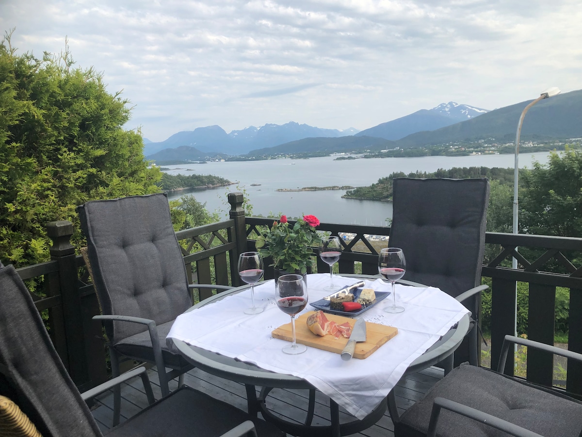Vue fantastique depuis le coin salon à l'extérieur de l'appartement ! En partie également avec toit et lampe chauffante pour les jours plus froids ou pluvieux. Parfait pour le petit déjeuner et se détendre le soir avec une vue, même par mauvais temps. Appartement avec 2 chambres, un salon avec cuisine intégrée et une salle de bain. Situé à proximité du centre d'Ålesund - 3 minutes en voiture et 20 minutes à pied. Zone de randonnée d'Aksla juste à l'extérieur de l'appartement. Stationnements gratuits. Lits doubles dans chaque chambre. Cuisine entièrement équipée avec tout ce dont vous avez besoin.