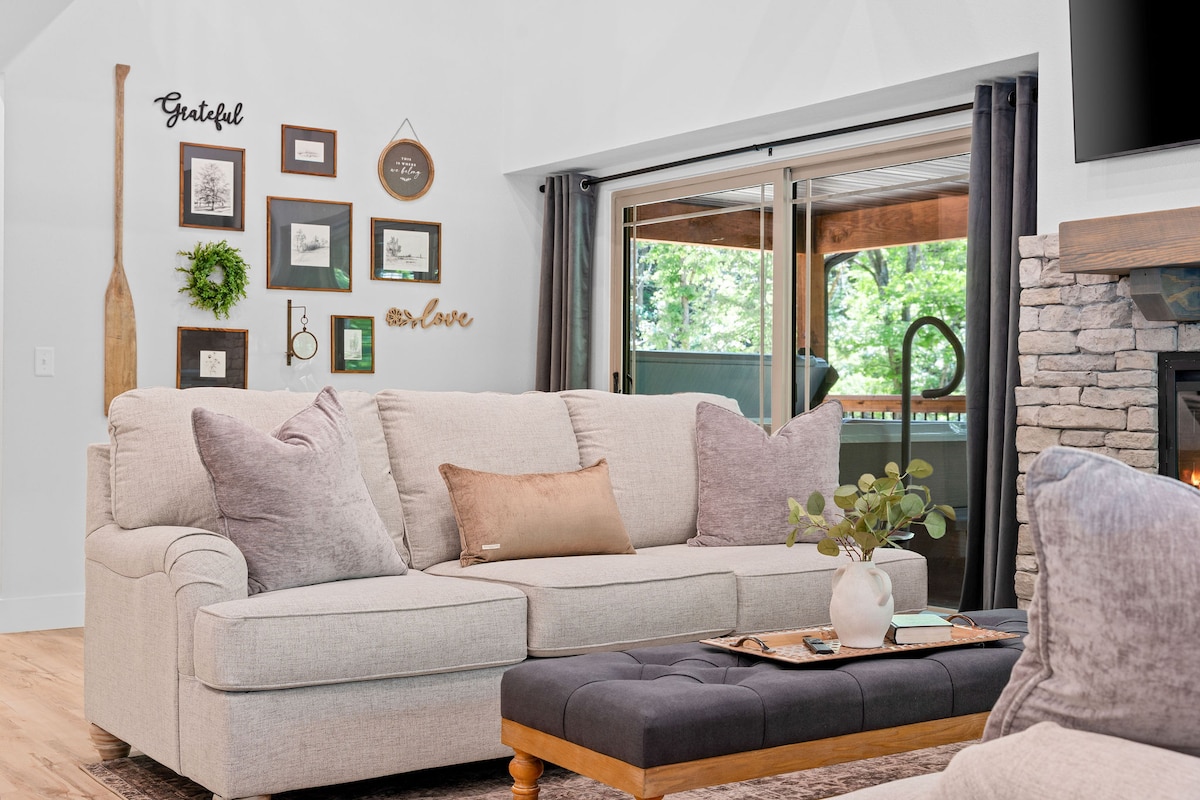 Niché parmi les collines vallonnées, à quelques minutes en voiture du cœur de Branson, se trouve ce chalet paisible de 2 chambres offrant une vue imprenable sur le lac Table Rock. Cette cabane nouvellement construite offre une escapade sereine loin de l'agitation du quotidien. Avec un décor moderne et élégant, le chalet respire la chaleur et le confort, invitant les voyageurs à se détendre et à profiter de la beauté de la nature. Les fenêtres du sol au plafond avec des vues incroyables en font une expérience unique à ne pas manquer.