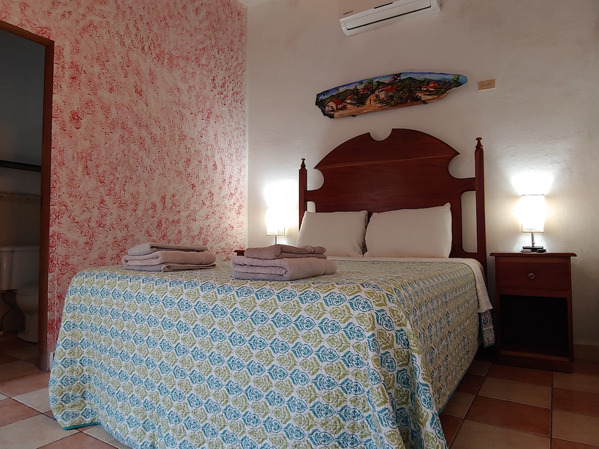 Nous sommes situés sur la plage, à Triunfo de la Cruz - un village Garifuna, à 10 minutes du parc central de Tela ; notre B & B dispose de 5 cabines pittoresques, construites avec des matériaux locaux, autour d'un jardin tropical ; environnement rustique, typique et primitif - très propre et SÛR ! - amélioré avec une technologie moderne - wi-fi GRATUIT, douches d'eau chaude, télévision par câble, ventilateurs muraux, deux lits doubles et un petit porche avec chaises et hamac dans chaque chambre !