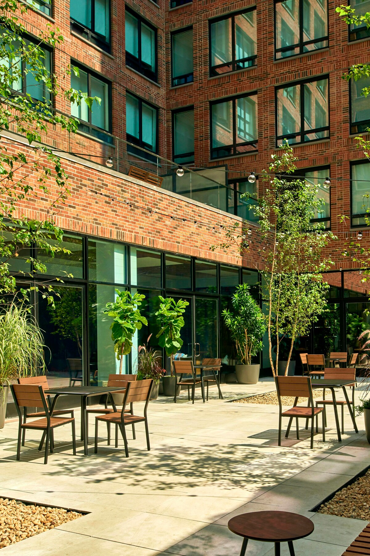Our Courtyard King rooms feature a wrap-around rich, wood alcove in which the bed and wall-mounted television reside, creating a cozy atmosphere for guests. Sizable windows overlook the hotel’s Courtyard, giving guests a glimpse of green in the concrete jungle. Solid walnut furniture, glass-enclosed rain showers and handmade porcelain tiles make up the first-rate design of the rooms, while convenient amenities like electronically-controlled shades and lighting, bluetooth radio and USB charging.