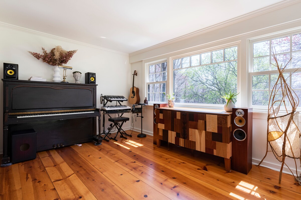 Au bout d'une route sans issue sur 12 acres, vous trouverez la retraite parfaite. Les points forts comprennent une piscine naturelle, une terrasse de yoga, un jacuzzi japonais extérieur et un sauna. Cuisine de chef, gril et fumoir. Le salon dispose d'un piano et peut accueillir un grand groupe. À l'extérieur, il y a un patio en pierre à 3 niveaux, une terrasse et un foyer avec système de sonorisation extérieur. Yoga privé et massage à domicile. Vélo Peloton, matelas Temperpedic et saatva, beaux draps ! *6 personnes supplémentaires avec location de la maison d'hôtes !