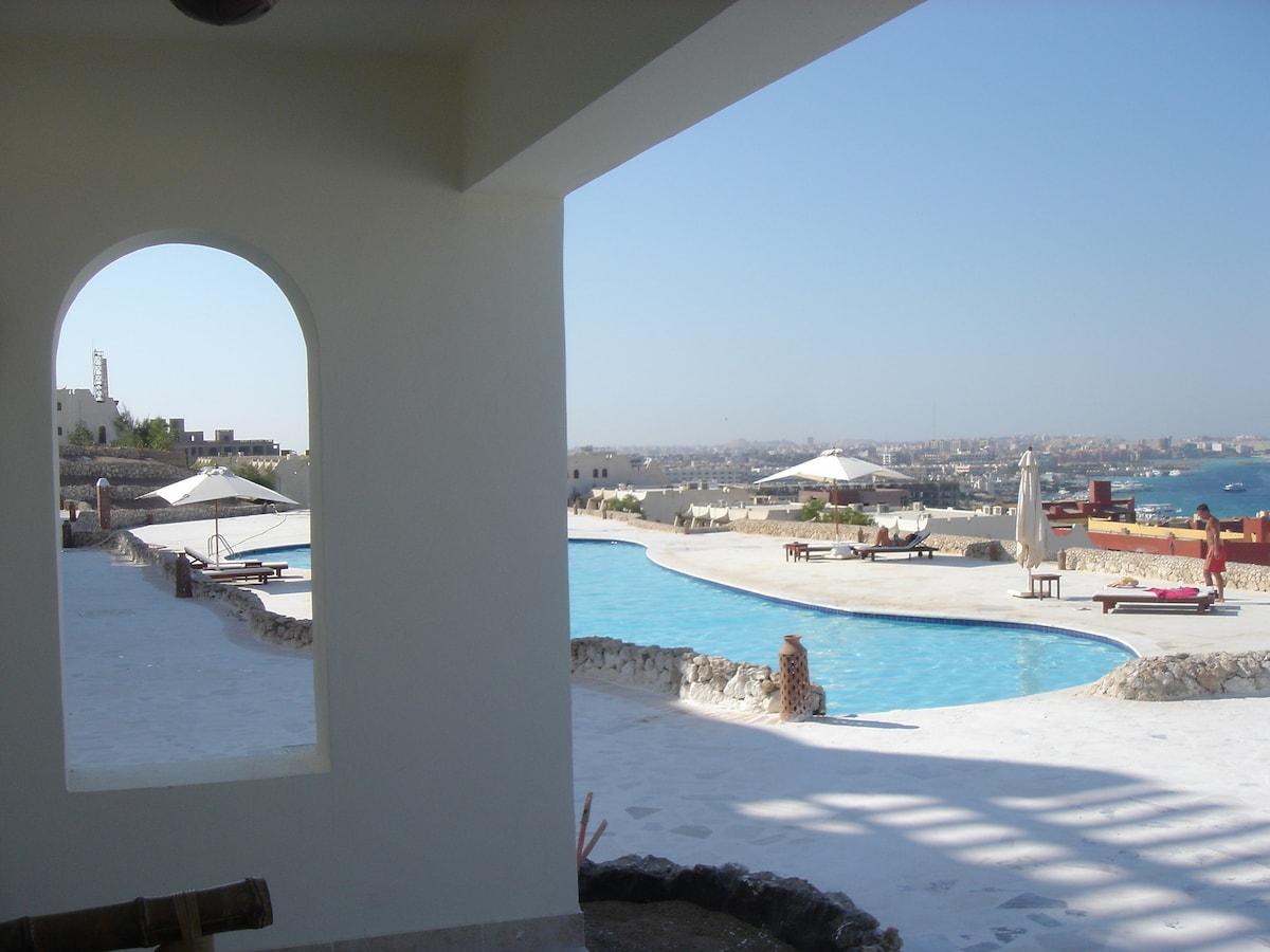 استمتع بتجربة سفر رائعة في هذا المسكن الجديد المكون من غرفة وصالة بشرفة والمجهز بكل الاحتياجات الضرورية لإقامة مريحة مثل التكييف و الانترنت المستقل والتلفزيون و ادوات الطباخة وغسالة اتوماتيك ومكواة مع الطاولة وسشوار .ويتميز بموقعه على البحر مباشرة بإطلالة بحرية رائعة ورؤية شروق الشمس وبجوار شاطئين وكورنيش مطل على الشاطئين. وبمجرد الخروج من المبنى يمكن الانتقال إلى عدة وجهات خلال 10دقائق او اقل مثل سيتي سنتر مول الذي يعتبر واحدا من أكبر المولات بالغردقة ومارينا الغردقة وكذلك شارع الشيراتون
